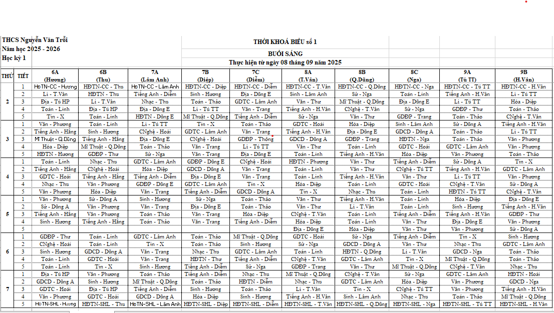 Thời khóa biểu số 1 năm học 2025-2026 (từ ngày mùng 8/9/2025 đến hết ngày 13/9/2025